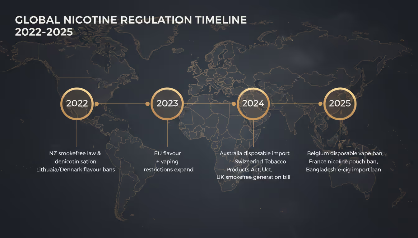 Since 2022, more than thirty countries have tightened or completely rewritten their nicotine regulation frameworks. The pattern is unmistakable: flavour bans across Europe, disposable vape bans from Ireland to Belgium, e-cigarette bans in Brazil, Mexico, India and Singapore, generational sales bans emerging in the UK and New Zealand, and product-control laws expanding from Switzerland to Australia. Even countries that previously allowed reduced-harm productsâlike France, Norway, and Canadaâare now expanding restrictions.